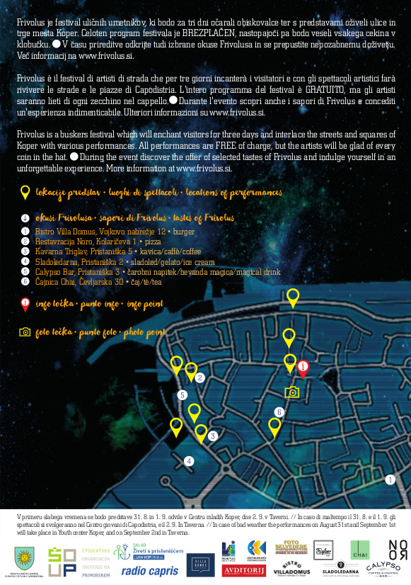 Pod okriljem Študentske organizacije Univerze na Primorskem (ŠOUP) se bo v Kopru od 31. avgust do 2. septembra ponovno odvil Frivolus – festival uličnih umetnikov.