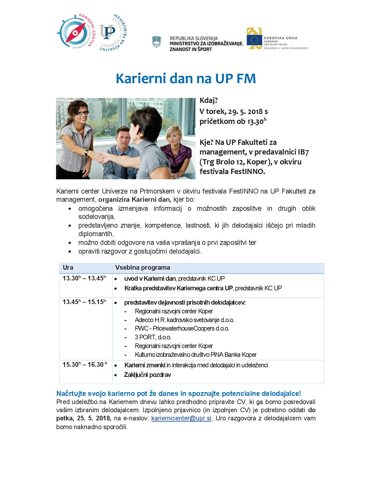 Karierni center Univerze na Primorskem v okviru festivala FestINNO v torek, 29. 5. 2018, od 13.30 ure dalje v predavalnici IB7 na UP FM (Trg Brolo 12, Koper) organizira Karierni dan.
