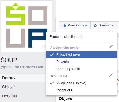 NASVET: obišči Facebook stran ŠOUP in na gumbu Všečkano označi Prikaži kot prvo (primer: slika spodaj).